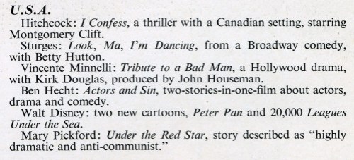 From the Works in Progress column of the July-September 1952 Sight & Sound. It looks like Mary Pickford is about to direct a anti-Communist weepy and Preston Sturges is about to begin another Hutton comedy. Neither appeared. The Minnelli film came out with the title The Bad and the Beautiful and is well worth checking out.