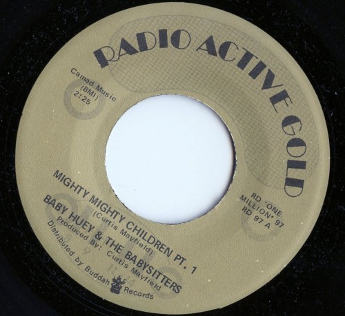 The record that I got is a single from the same time period as the release of the Living Legend LP. It has on it a track that was not included on the album or any of the CD reissues of it that I know of (making the most recent one something of a disappointment despite the great sound quality). The songs on the record are both covers of Curtis Mayfield’s Mighty Mighty (Spade and Whitey). For some reason the song is listed on the record as Mighty Mighty Children. The B side is the odd but fantastic version that is on Living Legend, but the A is a completely different, more straightforward version of Mighty Mighty without the little girl singing or the mention of Thunderbird (Christ what I wouldn’t do to get my hands on some of that stuff) or red beans and rice or ox tails. It does feature some amazing screaming from Baby Huey in the fade and can be heard here. For some reason the copy that I have is on Radio Active Gold records and not Curtom.