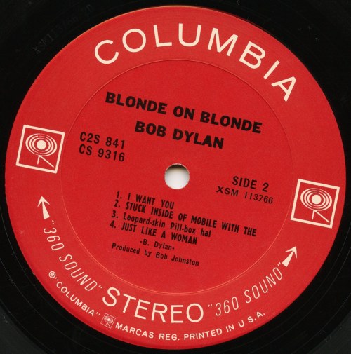 I’ve done this before but it’s just now occurred to me that this is a feature on its own. Here’s a recent pick up, a Dylan mystery: a stereo copy of Blonde on Blonde. It’s an early pressing but the absence of Claudia Cardinale and the whispering scene in the gate (see below) seem to rule out it being a first pressing—either way, the two records themselves are in pristine condition, virtually unplayed. The serial and matrix numbers, along with the “Stuck Inside Of Mobile With The” listing (the track listing in the gate continues the song’s title reading: “Memphis Blues Again”) and the presence of the “STEREO ‘360° SOUND'” logo all seem to indicate that it’s a first pressing. Despite this site‘s seemingly exhaustive study of the endless differences in the various versions of the LP’s release, I remain confused as to what exactly it is that I have here.