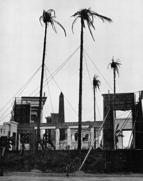 “Pinewood’s Alexandria stood through most of last winter and spring, through Elizabeth Taylor’s illness, the lengthy arguments over the Cleopatra insurance, the substitution of Rouben Mamoulian as director by Joseph L. Mankiewicz, and the calling in of Lawrence Durrell to write a new script. Now the whole Cleopatra project has removed itself to sunnier locations, the stone lions and temples and obelisks have been pulled down, and the twelve minutes or so of film actually shot by Mamoulian—whose final cost, one newspaper cruelly estimated, must have been in the region of a thousand pounds a foot—is all that survives. These photographs, taken shortly before the demolition of the set, record its sad splendours. The ‘Royal Calendar’ below was put up by the unit outside Elizabeth Taylor’s dressing-room; and will be set up again in California, or Italy, or wherever Alexandria is finally reconstructed.”