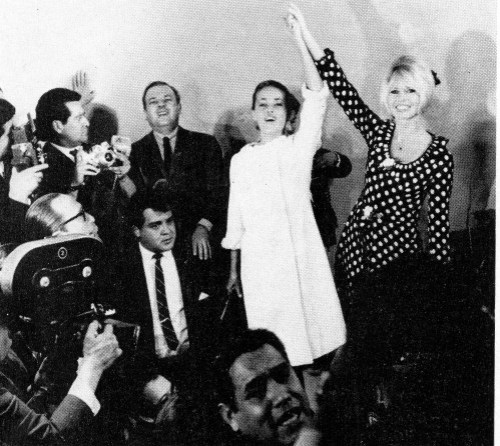 Jeanne Moreau and Brigitte Bardot in Mexico for a press conference to promote Louis Malle’s Viva Maria. 1965.