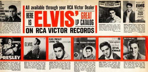 Paper inner sleeve from an awful circa 1963 stereo repress of 50,000,000 Elvis Fans Can’t Be Wrong: Elvis’ Gold Records – Volume 2. The sleeve depicts all of the Elvis LPs available from RCA up until that point. Above, in the second row, we see a great run of Elvis’s pre-army heyday, before the movie soundtrack rot set in. Now that is Elvis (LP) porn.