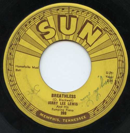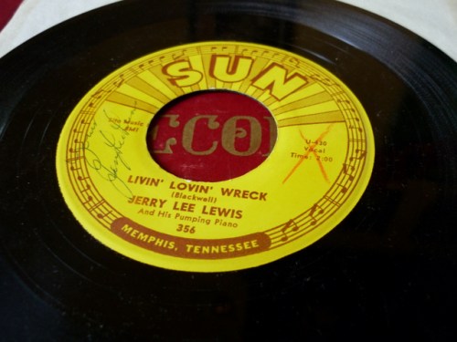 Now, I’m not saying that The Killer himself signed this but I sure as hell didn’t. When I entered “Jerry Lee Lewis signed” into ebay the other night I found an auction for a Sun 45 with a signature that looks pretty close to the one above. Check it out below.