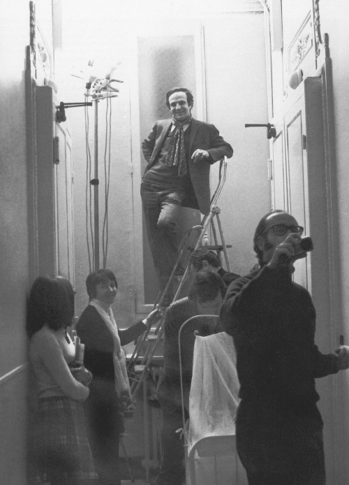 François Truffaut, Suzanne Schiffman, Claude Jade and Nestor Almendros in the apartment on the fourth floor, above the offices of Les Films du Carrosse, where the scenes of Antoine and Christine’s married life in Bed and Board were filmed. 1970.
