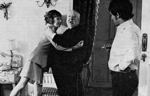 Hitchcock, with Anna Massey and Jon Finch, at work on Frenzy. 1972.