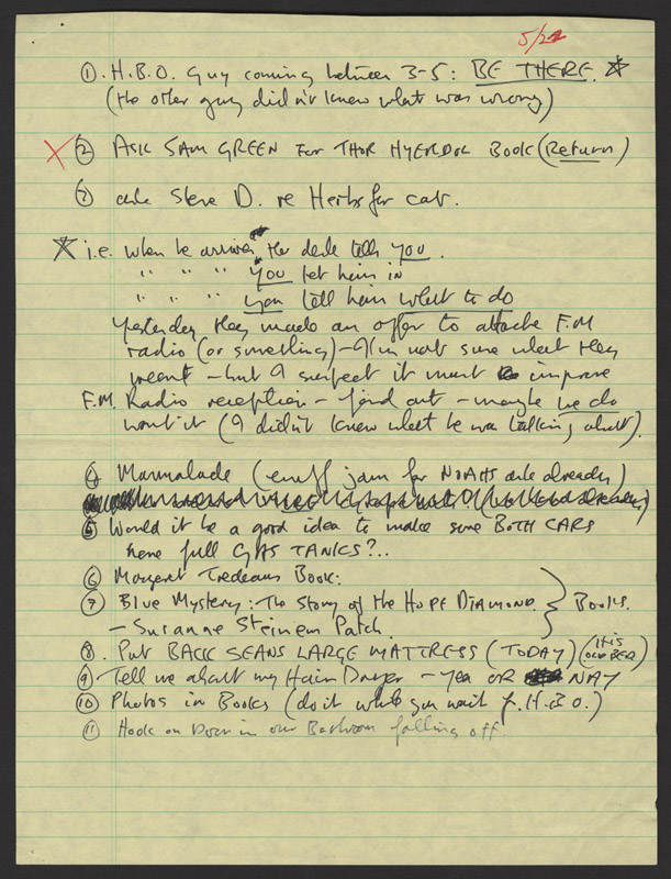 A handwritten to-do list up for auction on this site gives us a glimpse into John Lennon‘s Howard Hughes years. It seems as though Lennon had trouble understanding the technological mumbo jumbo coming out of the mouth of the “HBO guy” during his last encounter with him and has decided to delegate interacting with him to some underling (possibly Fred).