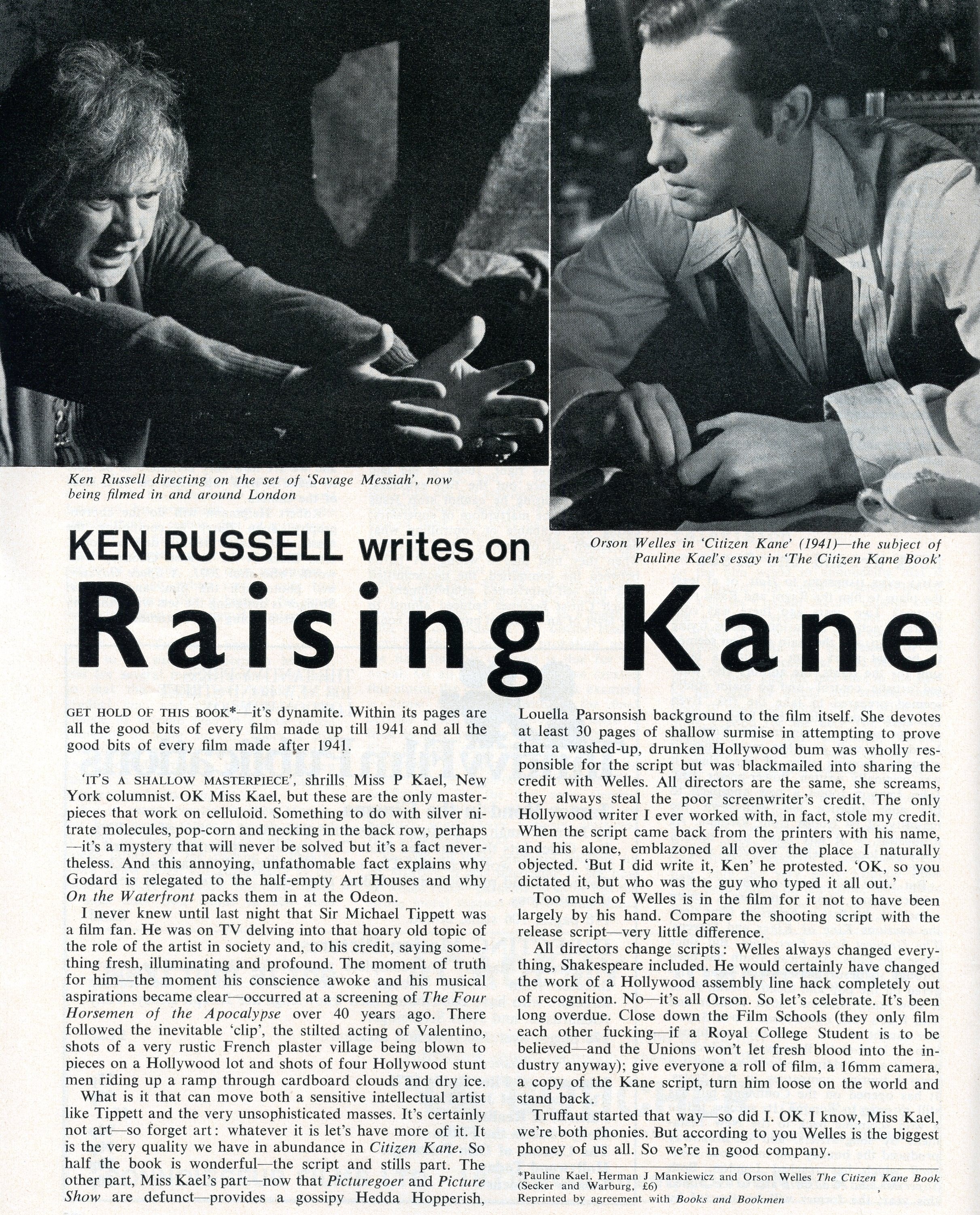 Ken Russell, who died on Sunday, reviews The Citizen Kane book for Films and Filming. May 1972.