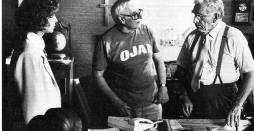 Lindsay Anderson with Ellen Greene and James Whitmore on the set of the TV movie Glory! Glory! 1989.