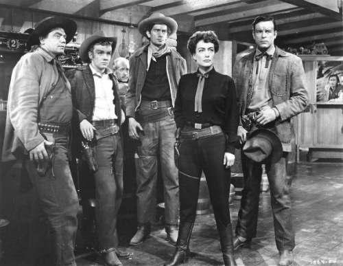Academy Award winning actor Ernest Borgnine (seen above with Spencer Tracy in Bad Day at Black Rock and below with Joan Crawford in Johnny Guitar) died today at age 95.