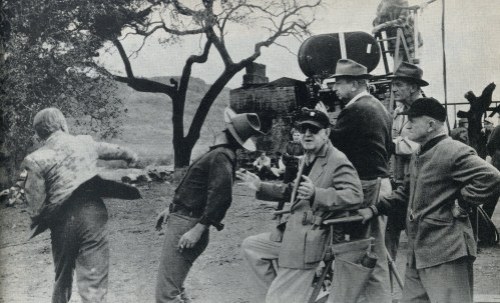 John Ford instructs Jimmy Stewart on the finer points of punching Duke Wayne in the face during the filming of The Man Who Shot Liberty Valance. 1962.