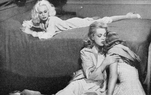 Mamie Van Doren watches Jan Sterling comfort co-ed student Diane Jergens after she has been beaten by a gang of high school dope fiends. High School Confidential. Jack Arnold. 1958.