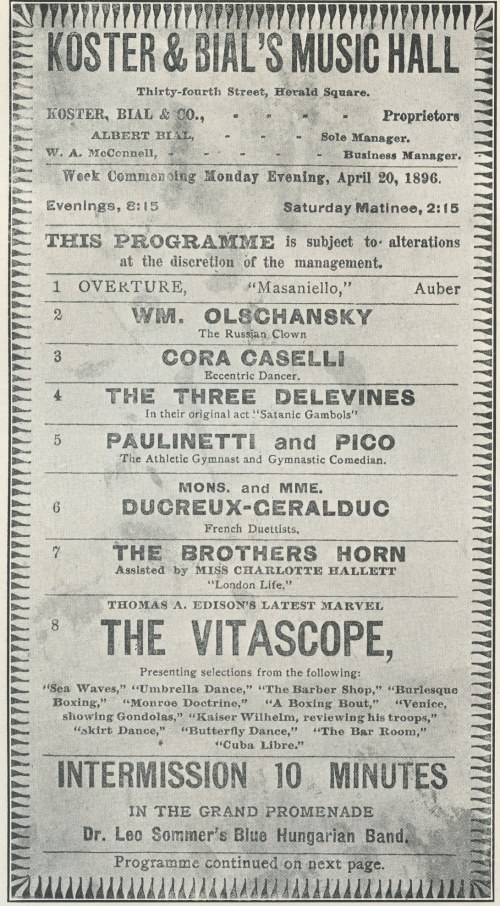 How Koster and Bial’s program for the week of April 20, 1896, announced the Broadway opening of the motion picture, projected on the screen by the Vitascope, as the eighth and final number on the variety bill.