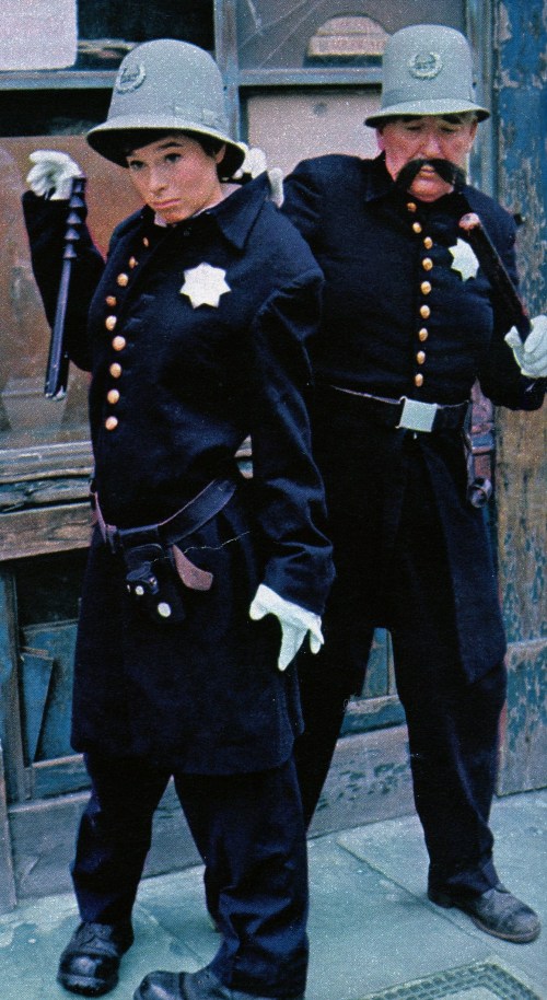 Geraldine Chaplin and Dick Talmadge dressed as Keystone Cops for their uncredited cameos—probably less than five seconds of screen time and if either actually appear in the film, they’re unrecognizable—in Casino Royale. 1967.