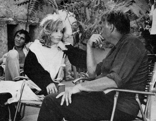 On the set of Modesty Blaise in Italy. Monica Vitti is joined by director Joseph Losey and Terence Stamp.
