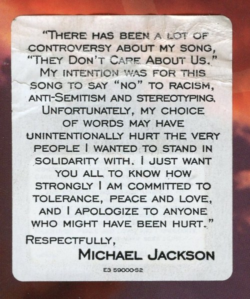 Some previous owner of my copy of this box set tried his best to pry the stickers off of the cover but thankfully didn’t succeed. The second one was added to the cover of the included booklet after controversy arose around the lyrical content of the song They Don’t Care About Us (which is a total banger, by the way). It’s incredible it wouldn’t have occurred to Michael or anyone around him that the lyric, “Jew me, sue me, everybody do me/Kick me, kike me, don’t you black or white me”, wouldn’t have attracted some heat. But Mike was having a bad couple of years.