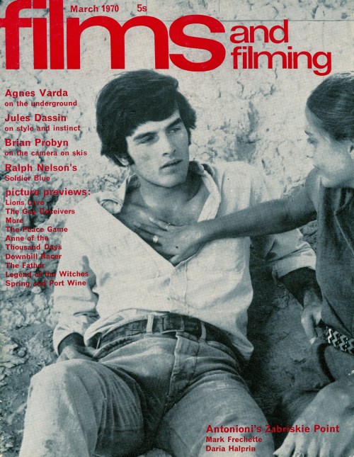 Oh, boy! Tonight, I finally got to see Michelangelo Antonioni’s 1970 feature Zabriskie Point. I generally like Antonioni’s films and I have been wanting to see this one for ages. It was his first film made in the United States (MGM payed the bill). While I liked the look of some of it, the film as a whole left me cold. I’m not sure exactly what Antonioni was getting at (it seemed to be a criticism of American consumerism–yawn) but as far as I’m concerned the film can be summed up with a quote from a black revolutionary character in the opening scene: a mix of jive and bullshit.